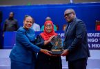 Spika wa Bunge la Jamhuri ya Muungano wa Tanzania na Mbunge wa Mbeya Mjini, Mhe. Dkt. Tulia Ackson (Mb), akifurahia jambo na Mkurugenzi Mkuu wa Kampuni ya Gesi ya Oryx Tanzania, Ndg. Benoit Araman wakati wa siku ya kuwawezesha wajasiriamali wanawake wa Mkoani Mbeya