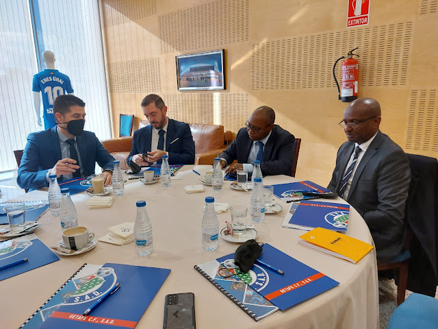 Ujumbe wa Tanzania ukiongozwa na Waziri wa Maliasili na Utalii Mhe. Damas Ndumbaro (Mb), akiwa katika mkutano na uongozi wa timu ya Getafe inayoshiriki daraja la kwanza (Laliga) ya Uhispania. Kushoto kwa Mhe. Waziri, ni Mhe. Samwel W. Shelukindo, Balozi wa Tanzania nchini Uhispania mwenye makazi yake mjini Paris, Ufaransa.