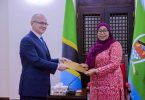 Rais wa Jamhuri ya Muungano wa Tanzania Mheshimiwa Samia Suluhu Hassan akisaini kitabu cha Wageni mara baada ya kuwasili katika Ikulu ya Entebbe nchini Uganda