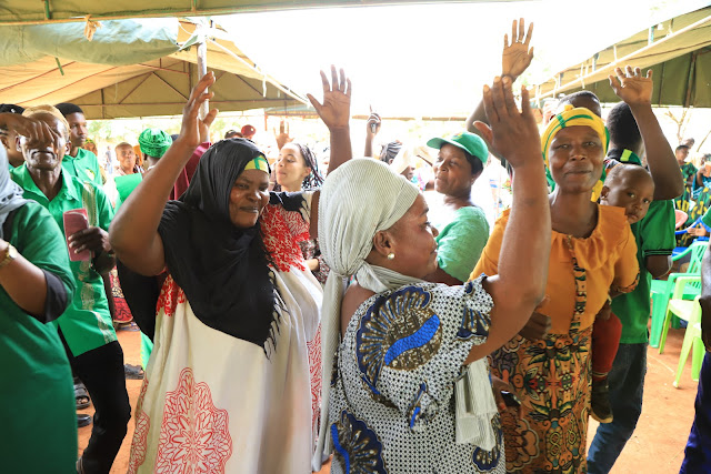 Wanachama wapya wakipunga mkono kwa mgeni rasmi ambaye ni Mjumbe wa Halmashauri kuu ya Chama Cha Mapinduzi (CCM ) Mkoa wa Shinyanga Mussa Ngangala .