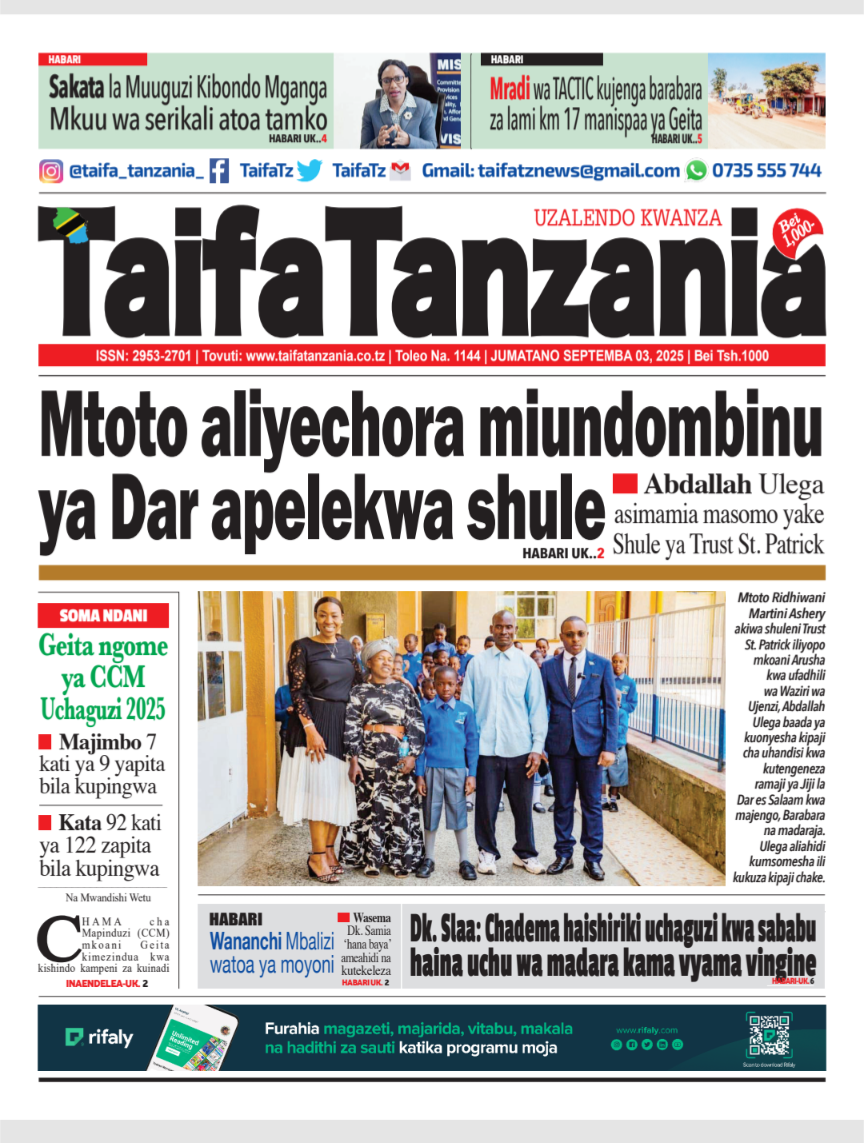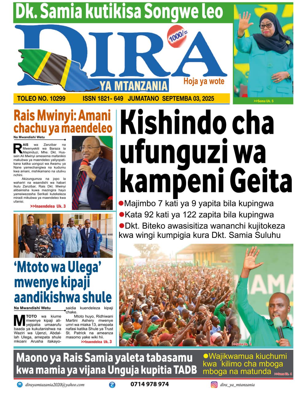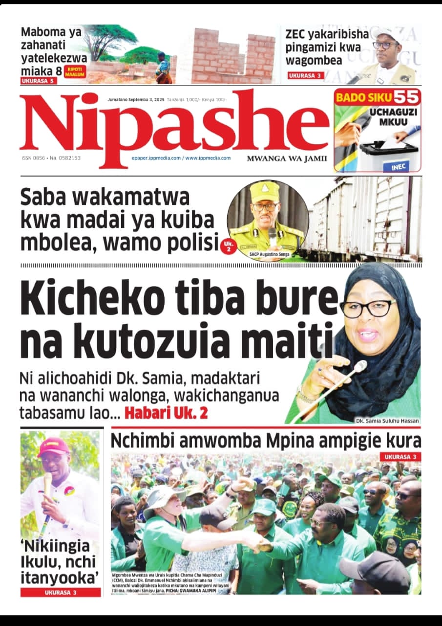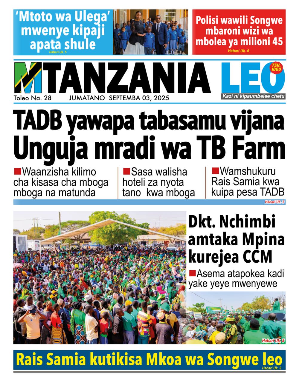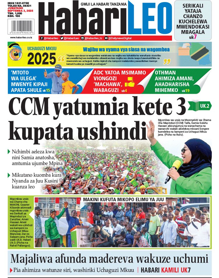 Featured • Magazeti PATA HABARI MOTO MOTO KATIKA MAGAZETI YA LEO JUMATANO SEPTEMBA 3,2025 1 month agoby Alex Sonna1,502 Views Written by Alex Sonna FacebookXGoogle+PinterestLinkedIn
