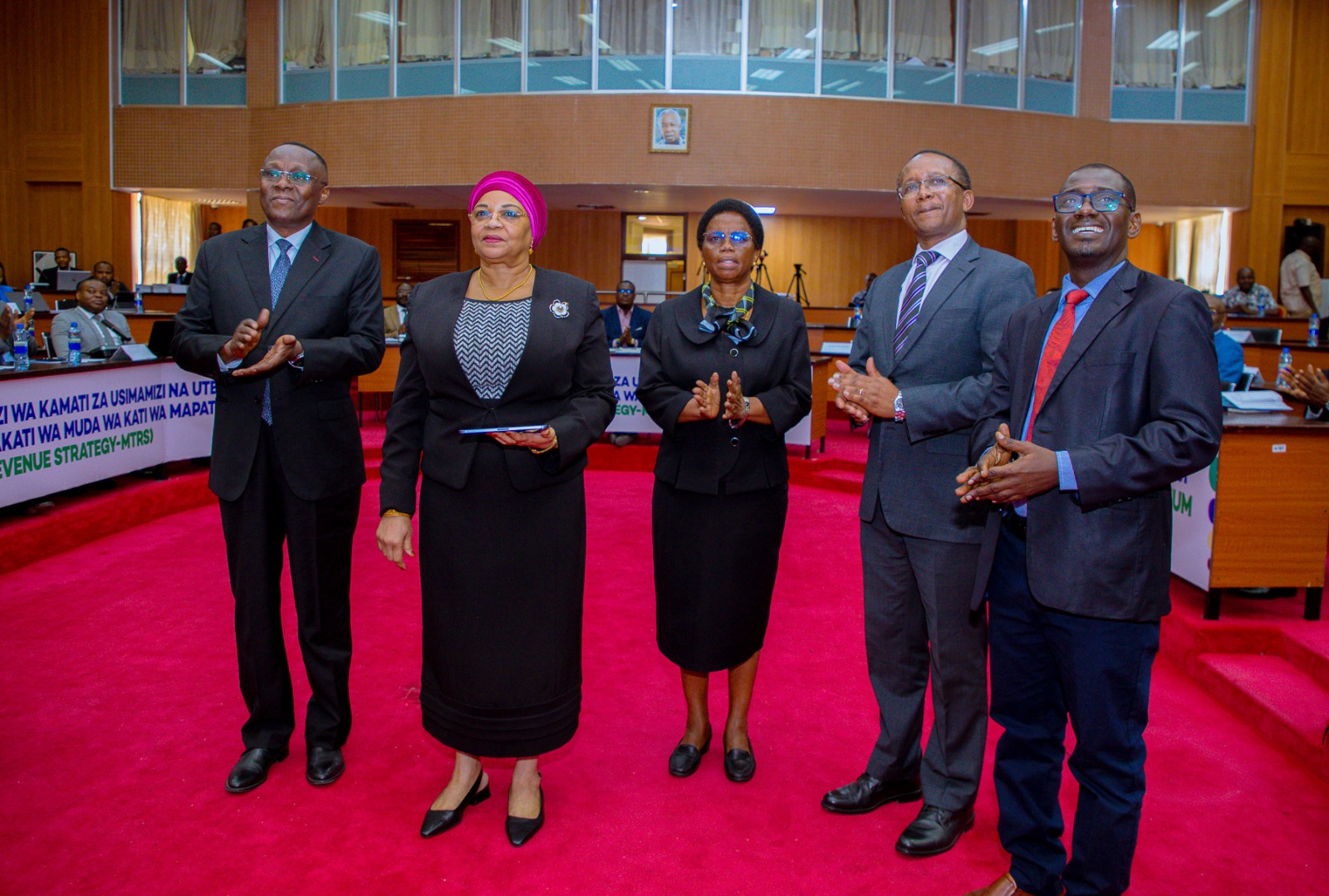 Katibu Mkuu Wizara ya Fedha, Dkt. Natu El-maamry Mwamba (Katikati aliyeketi), Katibu Mkuu, Ofisi ya Rais, Fedha na Mipango Zanzibar, Dkt. Juma Malik Akil (kushoto aliyeketi) na Naibu Katibu Mkuu Wizara ya Fedha, Bi. Jenifa Christian Omollo (kulia aliyeketi), wakiwa katika picha ya pamoja na baadhi ya Wajumbe wa Kamati ya usimamizi na utekelezaji wa Mkakati wa Muda wa Kati wa Ukusanyaji wa Mapato wa Miaka mitatu (Medium Term Review Strategy), baada ya hafla ya uzinduzi wa Mkakati huo ambao umepangwa kutekelezwa kuanzia mwaka 2025/2026 hadi 2027/2028 pamoja na Kamati za usimamizi na utekelezaji wa mkakati huo, katika ukumbi wa Kambarage, Treasury Square, jijini Dodoma.