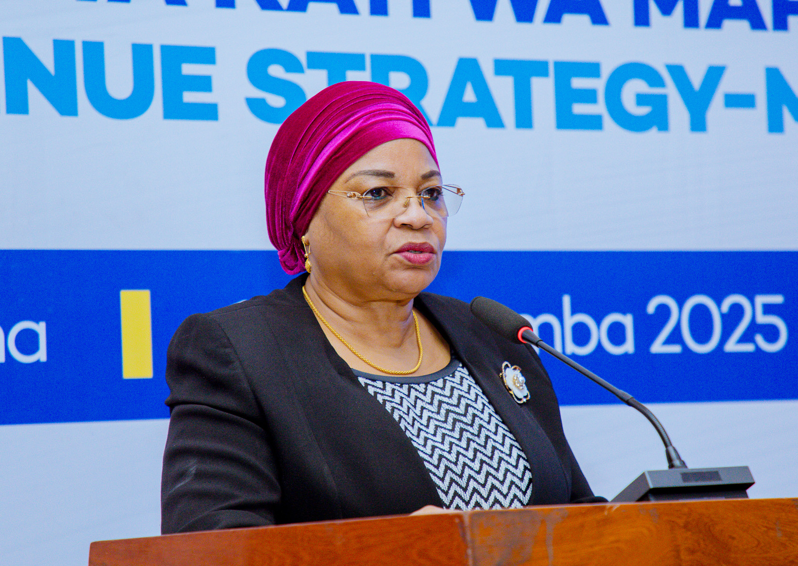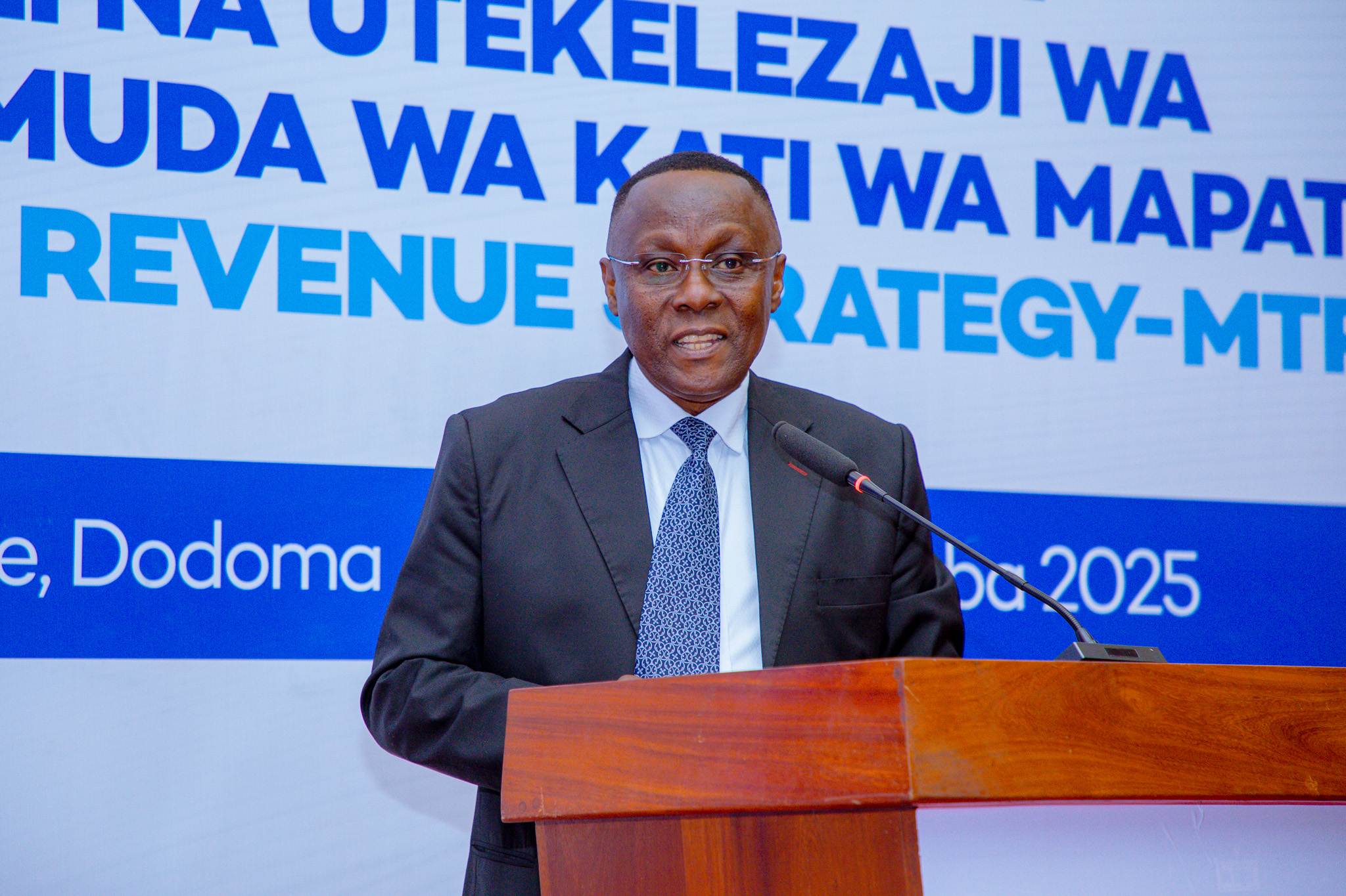 Katibu Mkuu Wizara ya Fedha, Dkt. Natu El-maamry Mwamba, akizungumza wakati akizindua Mkakati wa Muda wa Kati wa Ukusanyaji wa Mapato wa Miaka mitatu (Medium Term Review Strategy) uliopangwa kutekelezwa kuanzia mwaka 2025/2026 hadi 2027/2028, pamoja na Kamati za usimamizi na utekelezaji wa mkakati huo, katika ukumbi wa Kambarage, Treasury Square, jijini Dodoma, ambapo pamoja na mambo mengine alisema kuwa alisema kuwa Mkakati huo utaweka misingi imara ya ukusanyaji wa mapato, kuweka utabirifu wa sera za mapato na kuongeza makusanyo ya mapato, kuongeza uhiari wa ulipaji kodi, kutambua na kuziba mianya ya ukwepaji wa kodi, kupunguza nakisi ya bajeti na kuimarisha imani ya wananchi na uwekezaji katika mfumo wa mapato.