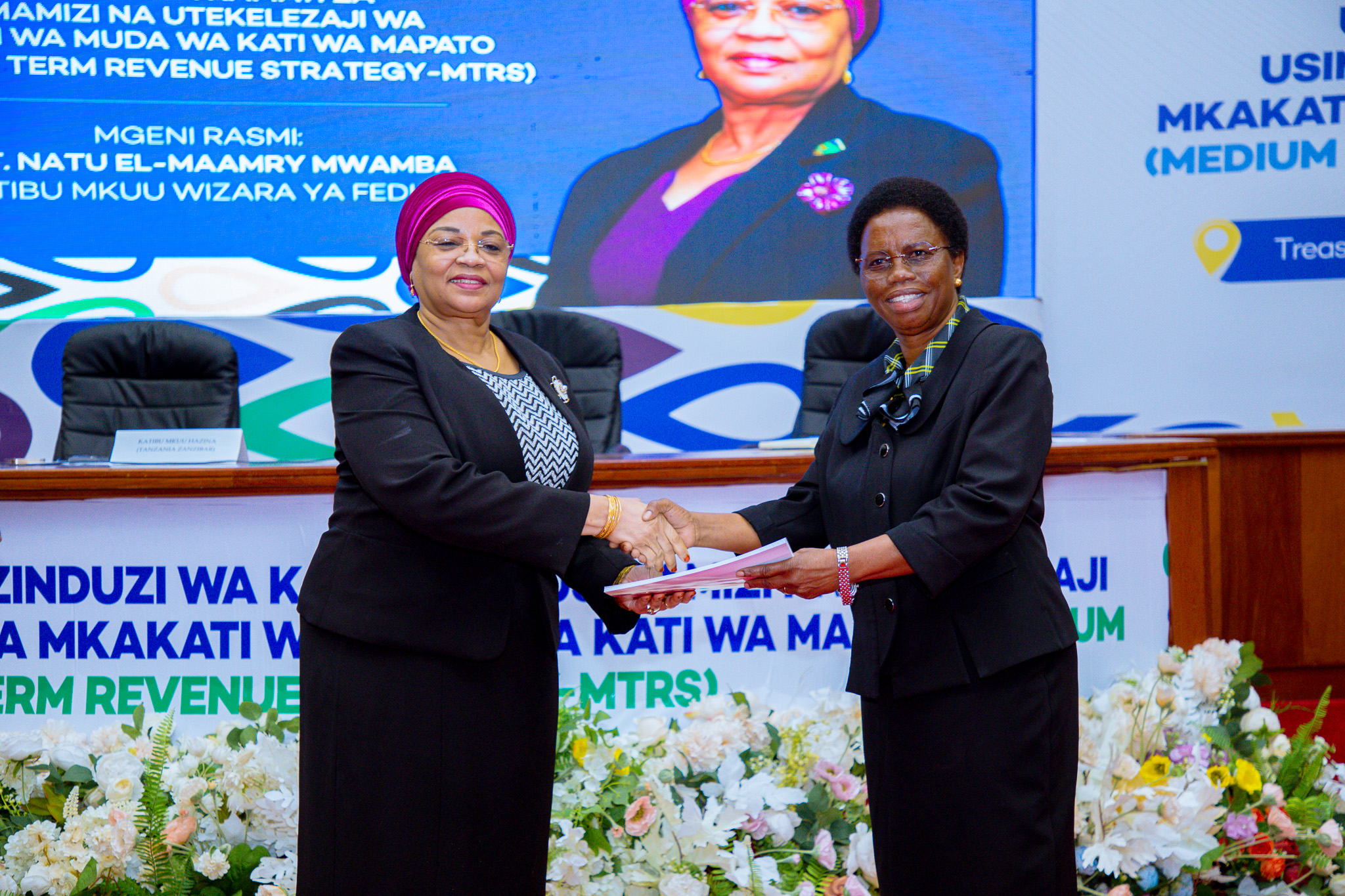 Katibu Mkuu Wizara ya Fedha, Dkt. Natu El-maamry Mwamba (Kulia), akimkabidhi Mkakati wa Muda wa Kati wa Ukusanyaji wa Mapato wa Miaka mitatu (Medium Term Review Strategy), Naibu Katibu Mkuu Wizara ya Fedha, Bi. Jenifa Christian Omollo, wakati wa hafla ya uzinduzi wa Mkakati huo ambao umepangwa kutekelezwa kuanzia mwaka 2025/2026 hadi 2027/2028 pamoja na Kamati za usimamizi na utekelezaji wa mkakati huo, katika ukumbi wa Kambarage, Treasury Square, jijini Dodoma.