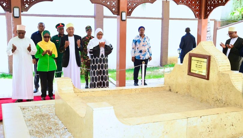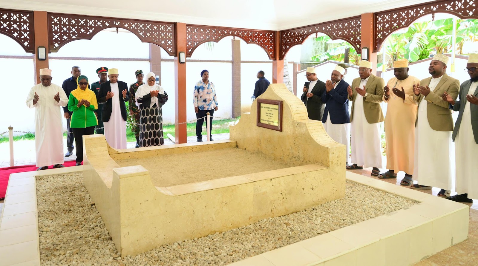 Mgombea wa nafasi ya Urais wa Jamhuri ya Muungano wa Tanzania kupitia Chama cha Mapinduzi (CCM) Taifa Dkt. Samia Suluhu Hassan akiwa na Mgombea wa nafasi ya Rais wa Zanzibar Ndugu Dkt. Hussein Ali Mwinyi pamoja na viongozi wengine wakiomba dua kwenye kaburi la aliyekuwa Rais wa Kwanza wa Zanzibar Hayati Sheikh Abeid Amani Karume katika Afisi Kuu ya CCM Kisiwandui, Zanzibar tarehe 19 Septemba, 2025. Dkt. Samia yupo Zanzibar kwenye Kampeni za kisiasa Visiwani Zanzibar, akitarajiwa kuwa na Mkutano wa kampeni Unguja na Pemba Visiwani Zanzibar.