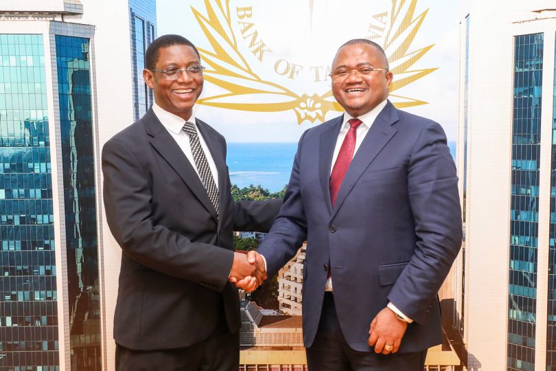 Gavana wa Benki Kuu ya Tanzania (BOT), Emmanuel Tutuba (kushoto) akimpongeza Mkurugenzi Mtendaji wa Benki ya CRDB, Abdulmajid Mussa Nsekela (kulia) wakati wa mkutano wa kujadili utekelezaji wa mageuzi ya mfumo mkuu wa benki hiyo, hatua ya kimkakati inayolenga kuboresha huduma, kuimarisha usalama wa miamala na kukuza uchumi. Mkutano huo ulihudhuriwa na Manaibu Gavana wa BOT, pamoja na viongozi wengine waandamizi wa BOT na Benki ya CRDB.