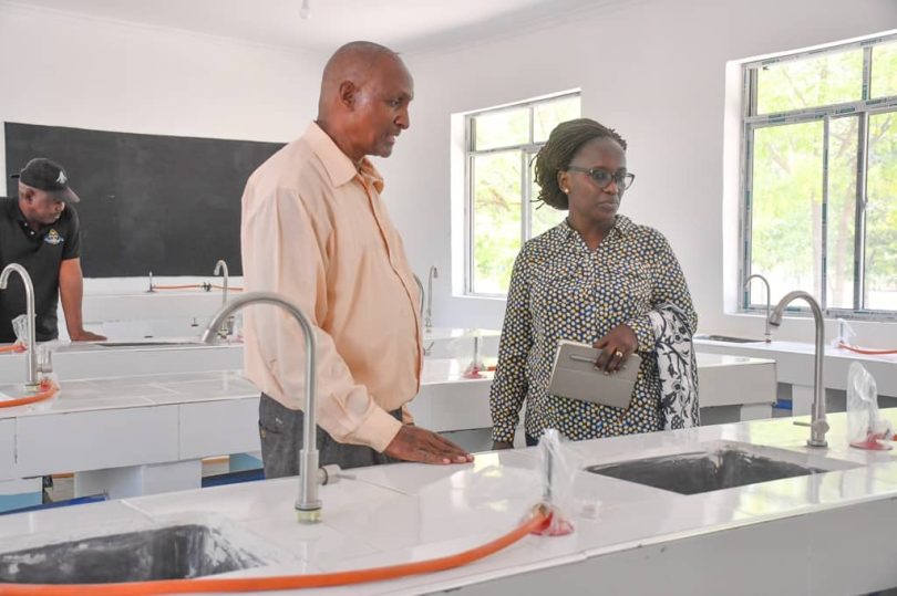 Bi. Atugonza David akiwa na Mkuu wa Shule ya Sekondari Pangale Mwl. Sengi Msaru wakati wa kukagua mradi wa ukarabati wa maabara tatu za Sayansi zilizofadhiliwa na UNICEF, CANADA kwa usimamizi wa TEA.
