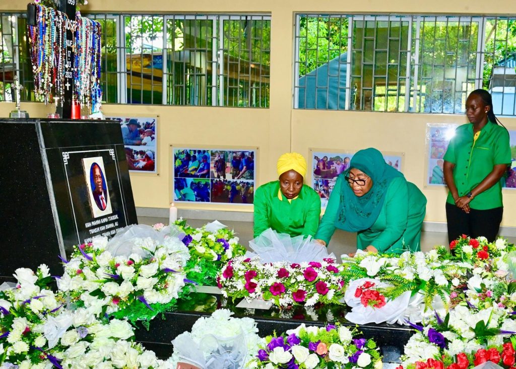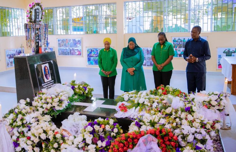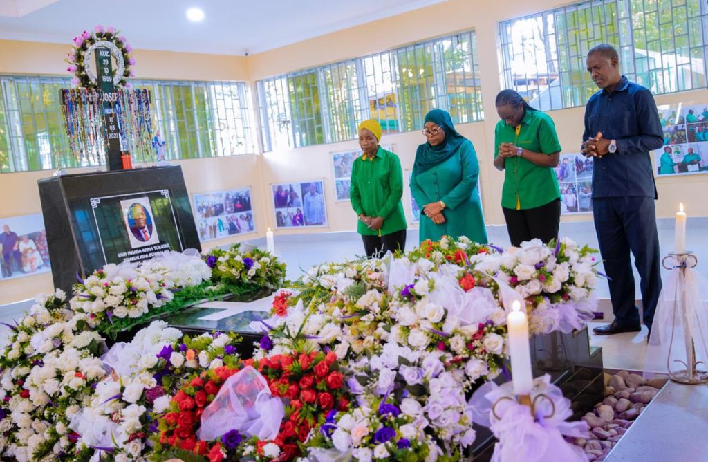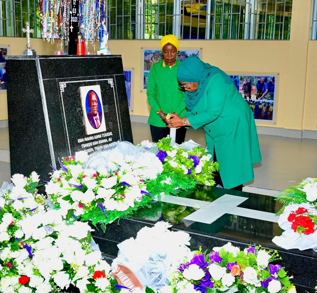Mgombea wa nafasi ya Rais wa Jamhuri ya Muungano wa Tanzania na Mwenyekiti wa Chama cha Mapinduzi (CCM) Taifa Ndugu Dkt. Samia Suluhu Hassan akiweka shada la maua katika Kaburi la Rais wa Awamu ya Tano Hayati Dkt. John Pombe Magufuli, Rubambangwe Chato mkoani Geita tarehe 13 Oktoba, 2025.