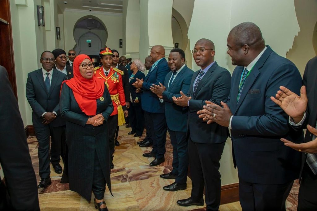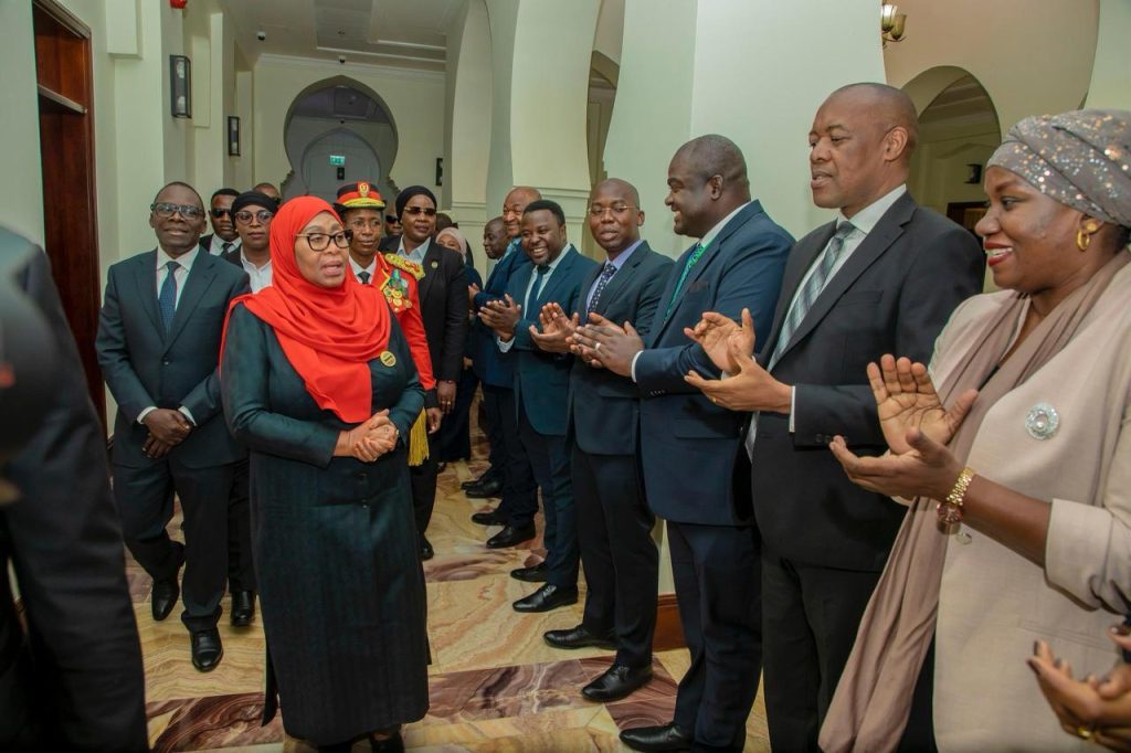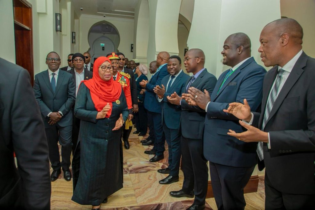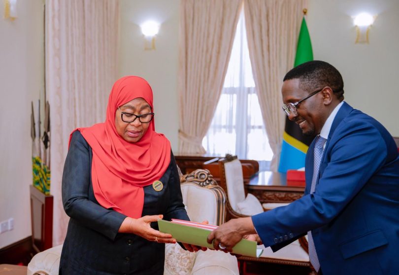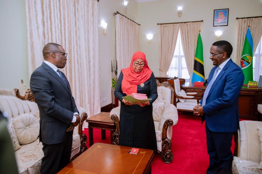 Rais wa Jamhuri ya Muungano wa Tanzania, Mhe. Dkt. Samia Suluhu Hassan akikabidhiwa nyaraka za kazi kutoka kwa Katibu Mkuu Kiongozi, Balozi Dkt. Moses Kusiluka mara baada ya kuwasili katika Ofisi yake Ikulu Chamwino, akiwa tayari kuanza rasmi majukumu yake baada ya kuapishwa.Β