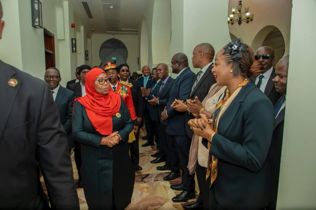 Rais wa Jamhuri ya Muungano wa Tanzania, Mhe. Dkt. Samia Suluhu Hassan akipokelewa na Watumishi wa Ofisi ya Rais, Ikulu alipowasili Ikulu ya Chamwino, Dodoma mara baada ya kuapishwa.