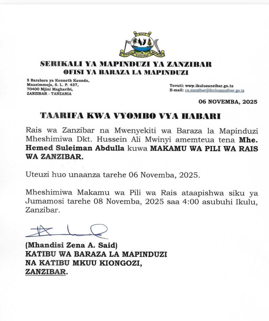 RAIS DKT.MWINYI AMTEUA HEMED ABDULLA KUWA MAKAMU WA PILI WA RAIS WA ZANZIBAR