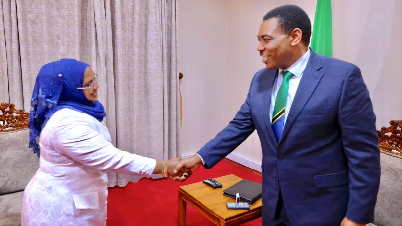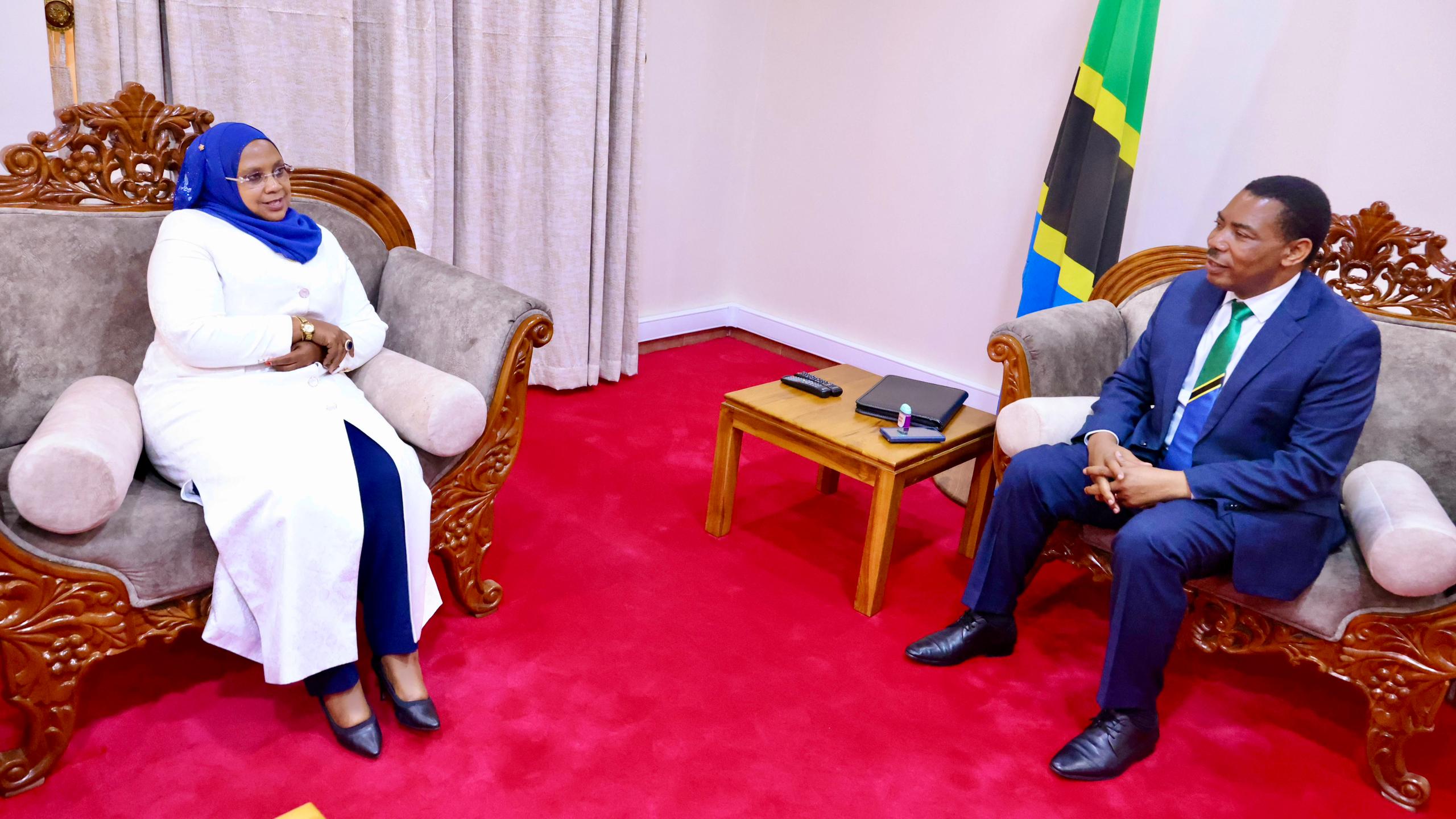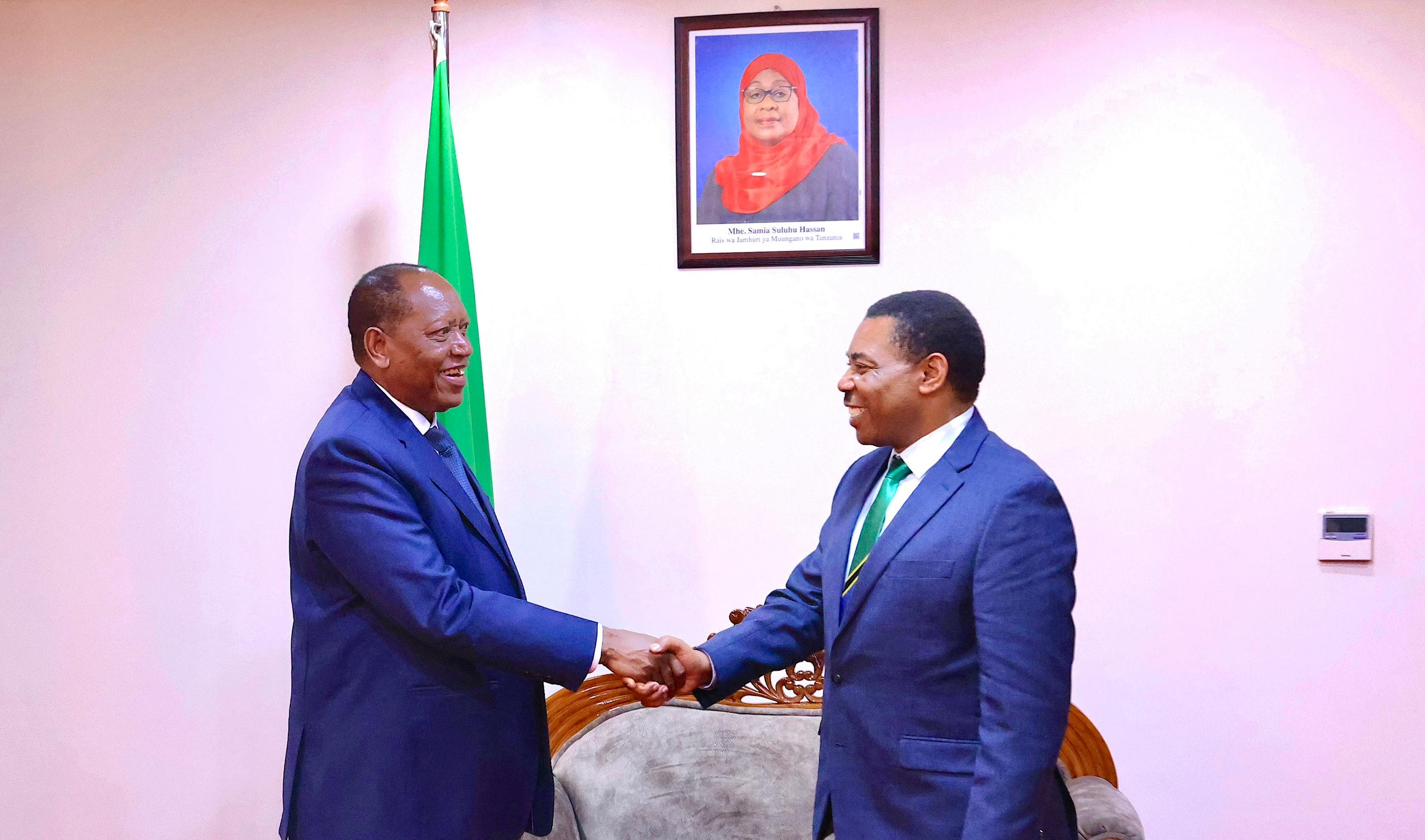 Waziri Mkuu, Dkt. Mwigulu Nchemba akisalimiana na Waziri wa Habari, Utamaduni, Sanaa na Michezo , Profesa Paramagamba Kabudi ofisini kwa Waziri Mkuu, Mlimwa jijini Dodoma, Novemba 18, 20256. (Picha na Ofisi ya Waziri Mkuu)