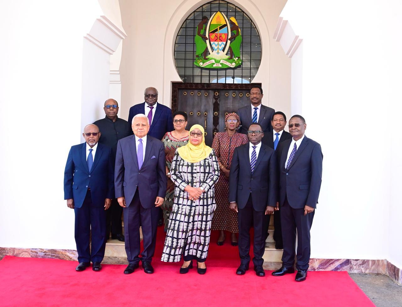 Mwenyekiti wa Tume Huru ya Uchunguzi wa Matukio ya Uvunjifu wa Amani yaliyotokea wakati na baada ya Uchaguzi Mkuu uliofanyika tarehe 29 Oktoba, 2025, Jaji Mkuu Mstaafu wa Mahakama ya Tanzania Mhe. Mohamed Chande Othman akiwa pamoja na Wajumbe wa Tume hiyo kabla ya kuzinduliwa na Rais wa Jamhuri ya Muungano wa Tanzania Mheshimiwa Dkt. Samia Suluhu Hassan, Ikulu Chamwino Mkoani Dodoma tarehe 20 Novemba, 2025.