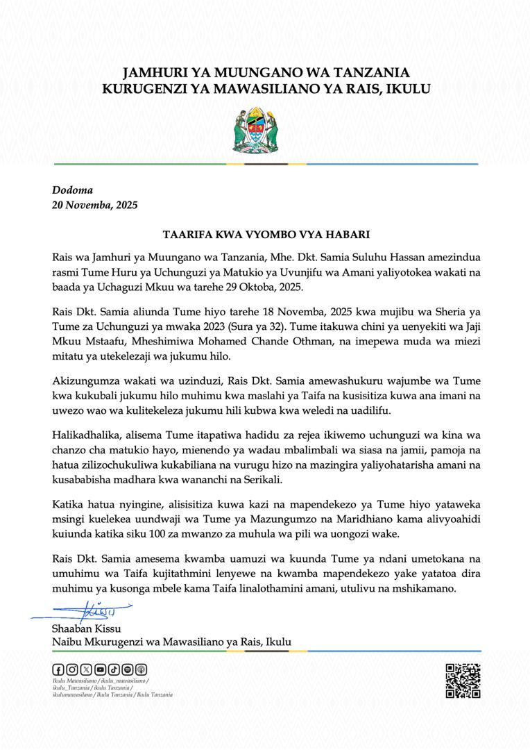 RAIS SAMIA AZINDUA TUME HURU YA UCHUNGUZI WA MATUKIO YA OKTOBA 29, 2025