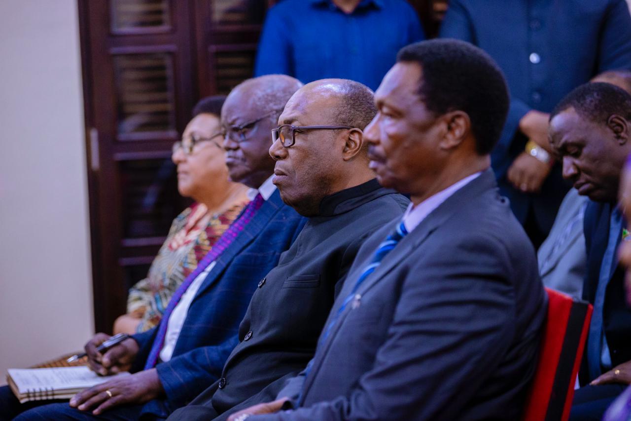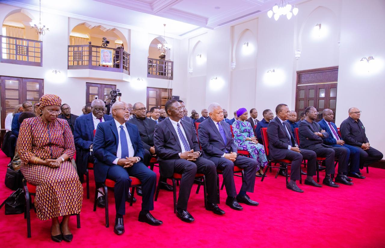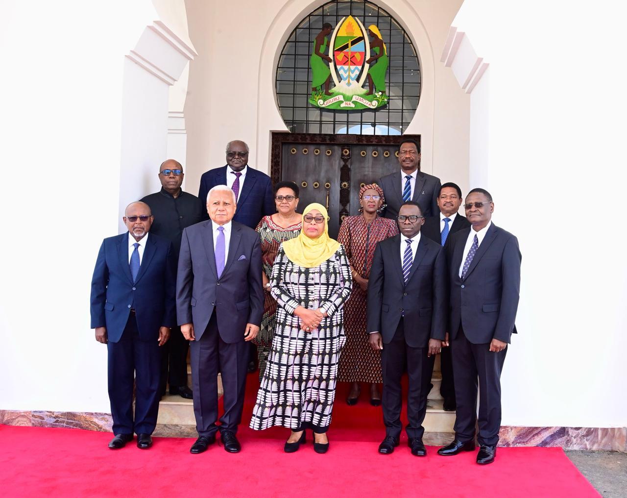 Mwenyekiti wa Tume Huru ya Uchunguzi wa Matukio ya Uvunjifu wa Amani yaliyotokea wakati na baada ya Uchaguzi Mkuu uliofanyika tarehe 29 Oktoba, 2025, Jaji Mkuu Mstaafu wa Mahakama ya Tanzania Mhe. Mohamed Chande Othman akiwa pamoja na Wajumbe wa Tume hiyo kabla ya kuzinduliwa na Rais wa Jamhuri ya Muungano wa Tanzania Mheshimiwa Dkt. Samia Suluhu Hassan, Ikulu Chamwino Mkoani Dodoma tarehe 20 Novemba, 2025.