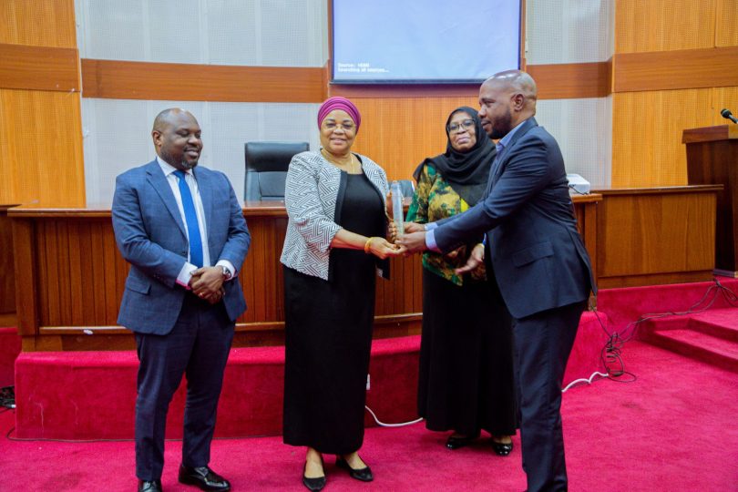 Katibu Mkuu wa Wizara ya Fedha, Dkt. Natu El-maamry Mwamba (Katikati), akipokea tuzo ya Wizara ya Fedha (Fungu 6), kutoka kwa Mkaguzi Mkuu wa Ndani wa Serikali Msaidizi, Mhandisi. Kenneth Nindie (wa pili kulia), baada ya Wizara ya Fedha kutangazwa mshindi wa tatu katika kipengele cha Idara za Serikali Zinazojitegemea (Independent Government Department) katika, mashindano ya Uwasilishaji Bora wa Hesabu za Serikali kwa mwaka 2024, yaliyofanyika tarehe 4 Desemba 2025 jijini Dar es Salaam, Wengine katika picha ni Manaibu Katibu Wakuu Wizara ya Fedha, Bw. Elijah Mwandumbya (wa kwanza kushoto) na Bi. Amina Khamis Shaaban (wa pili kulia)