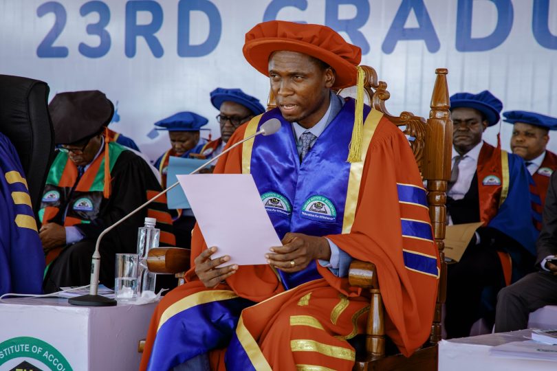 Afisa Mtendaji Mkuu wa Taasisi ya Uhasibu Tanzania (TIA), Profesa William Pallangyo, akizungumza na wahitimu na washiriki wa Mahafali ya 23 ya Taasisi ya Uhasibu Tanzania (TIA) yaliyofanyika Katika Viwanja vya TIA, Kurasini Jijini Dar es Salaam.