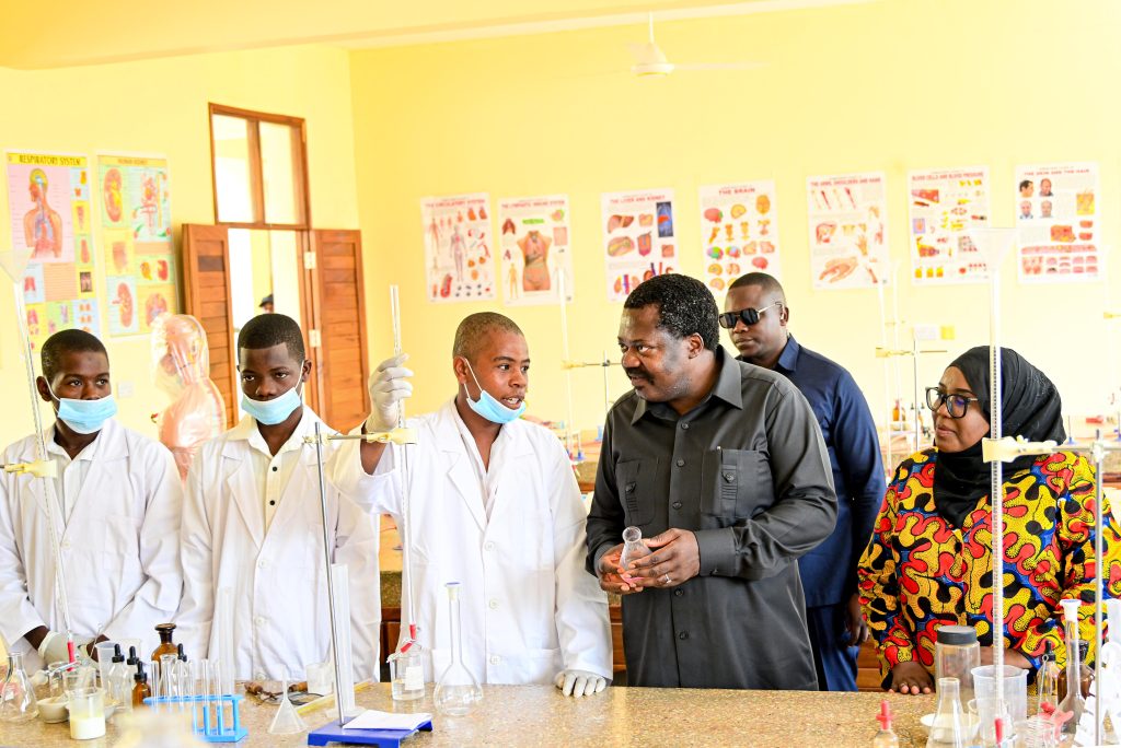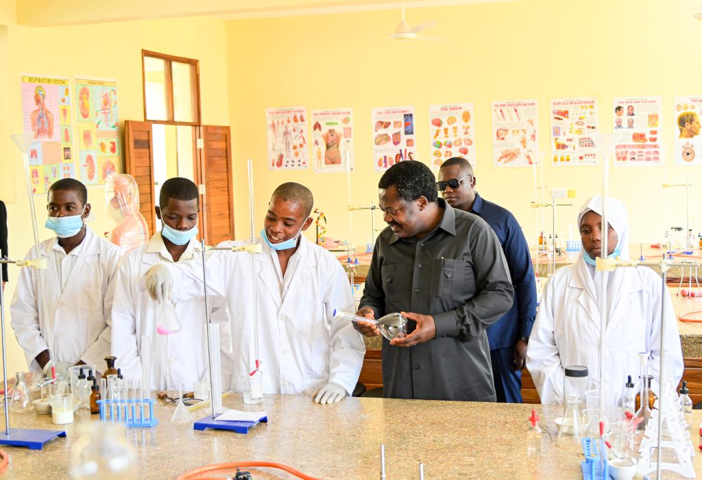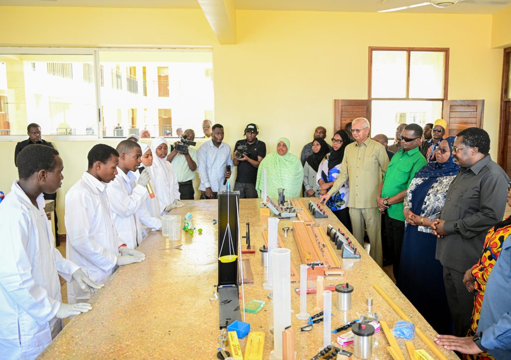Makamu wa Rais wa Jamhuri ya Muungano wa Tanzania Mhe.Balozi Dkt. Emmanuel Nchimbi akishuhudia wanafunzi wa Skuli ya Sekondari Makunduchi, wakifanya majaribio ya kemia kwa vitendo wakati wa Ufunguzi wa Skuli ya Sekondari ya Makunduchi, iliyopo Mkoa wa Kusini Unguja, Zanzibar ikiwa ni shamrashamra za Maadhimisho ya Miaka 62 ya Mapinduzi Matukufu ya Zanzibar leo tarehe 09 Januari 2025.