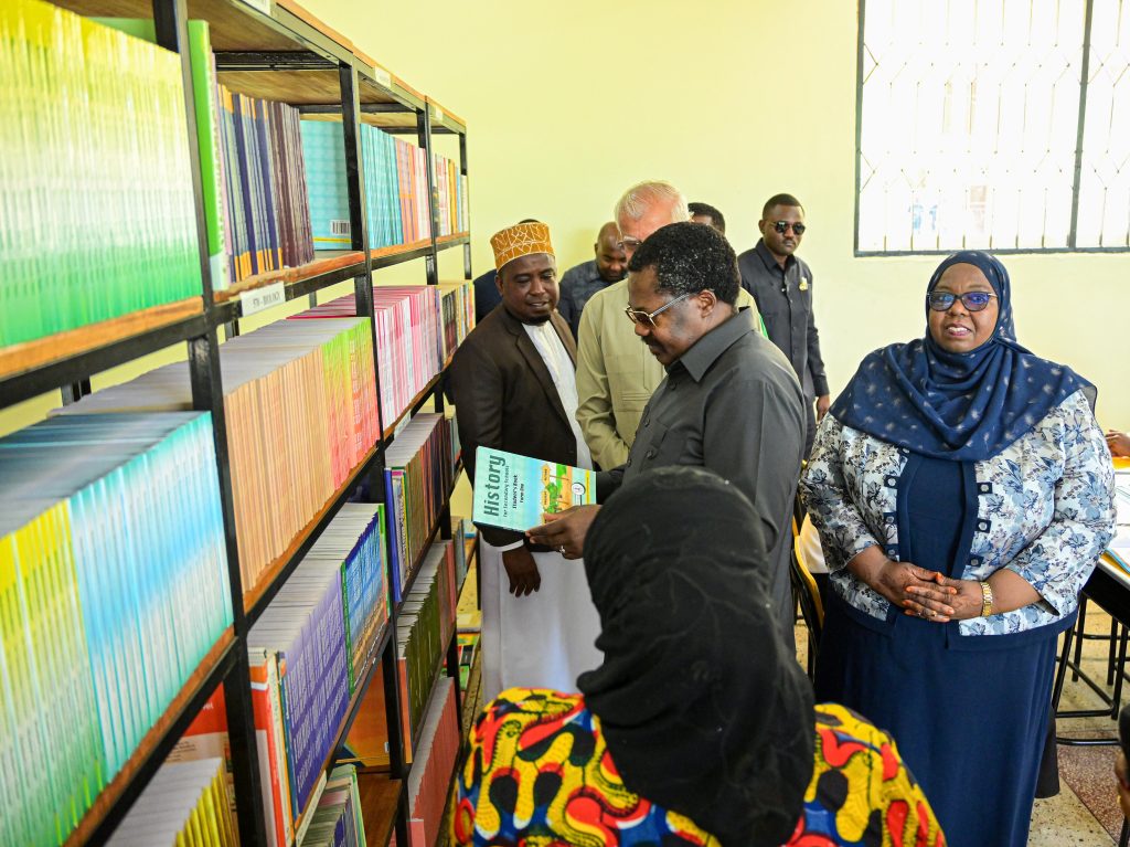 Makamu wa Rais wa Jamhuri ya Muungano wa Tanzania Mhe.Balozi Dkt. Emmanuel Nchimbi akikagua vitabu vya kujifunzia katika Maktaba ya Skuli ya Sekondari ya Makunduchi, wakati wa ufunguzi wa Skuli hiyo iliyopo Mkoa wa Kusini Unguja, Zanzibar ikiwa ni shamrashamra za Maadhimisho ya Miaka 62 ya Mapinduzi Matukufu ya Zanzibar leo tarehe 09 Januari 2025.