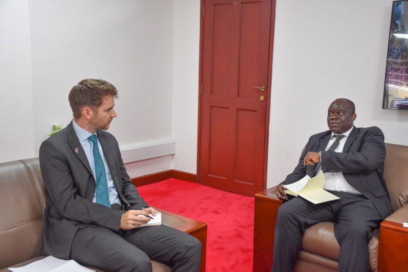 Kiongozi wa Programu Endelevu ya Mazingira kutoka Ubalozi wa Uingereza nchini Tanzania, Bw. Euan Davidson (kushoto) akizungumza jambo na Katibu Mkuu Ofisi ya Makamu wa Rais Dkt. Richard Muyungi wakati wa mazungumzo baina yao yaliyofanyika katika Ofisi ndogo ya Ofisi ya Makamu wa Rais, Luthuli Jijini Dar es Salaam Machi 05, 2026.