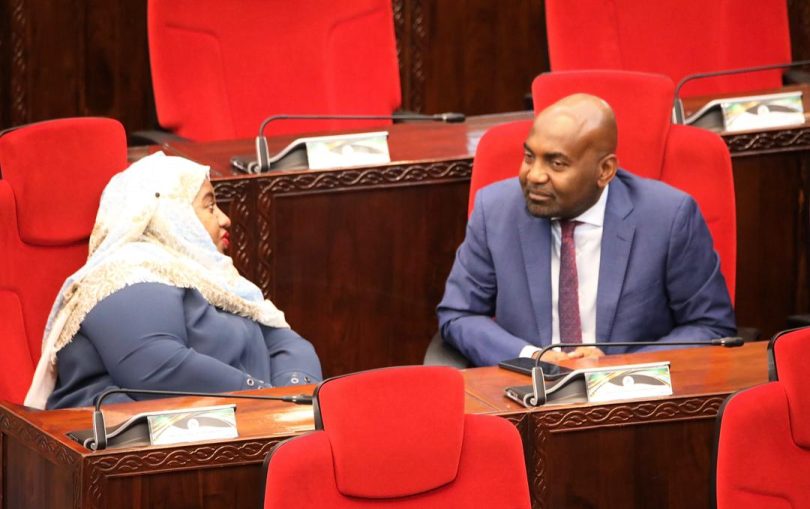 Waziri wa Nchi Ofisi ya Makamu wa Rais (Muungano na Mazingira) Mhe. Mhandisi Hamad Yussuf Masauni akizungumza na Mbunge wa Viti Maalum Mhe. Zainab Abdallah Issa wakati wa Kikao cha Tano cha Mkutano wa Tatu wa Bunge bungeni jijini Dodoma leo Aprili 09, 2026.