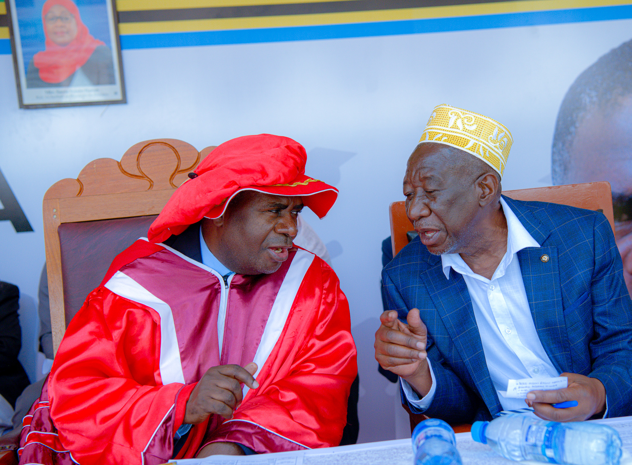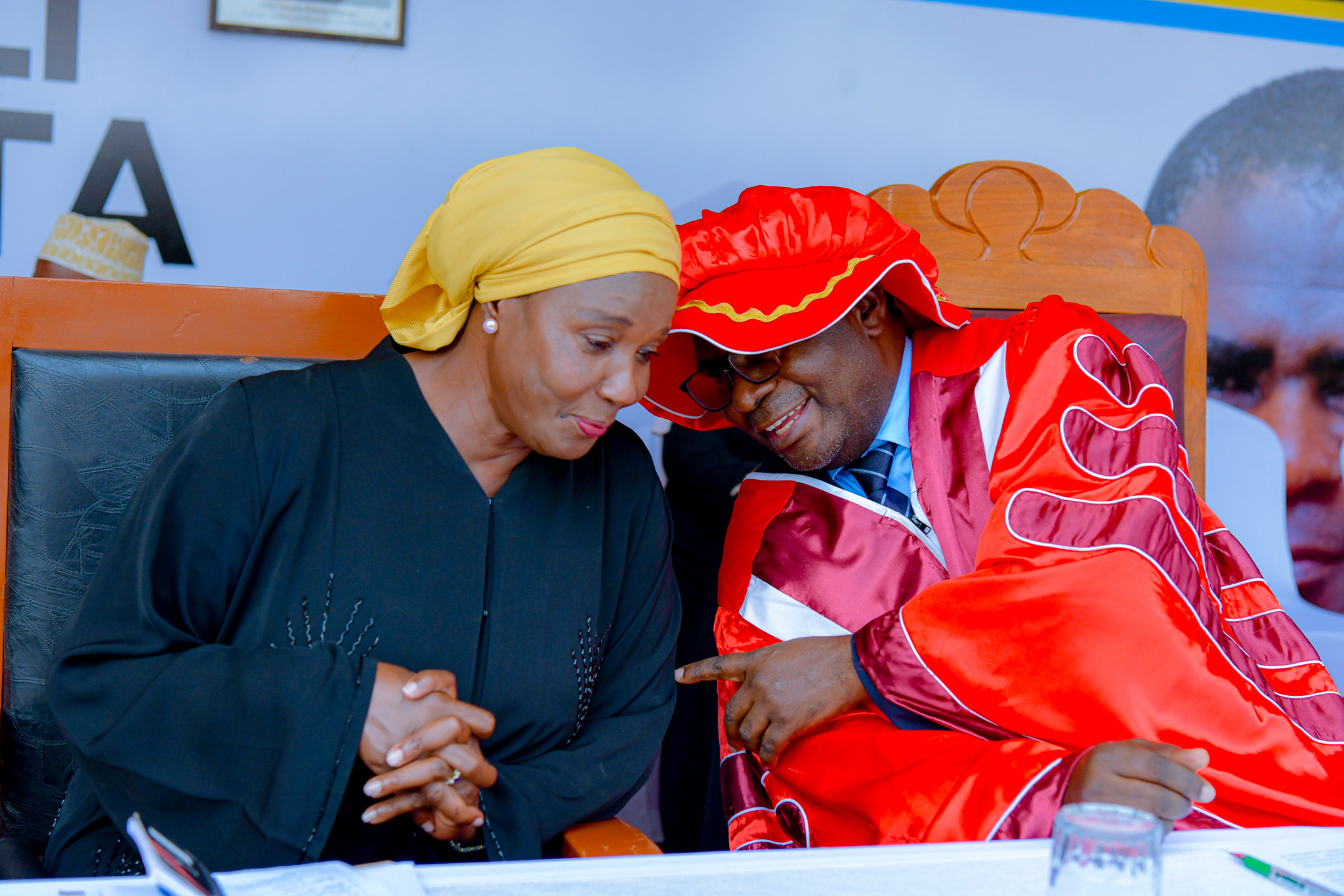Naibu Waziri wa Fedha, Mhe, Mhandisi Mshamu Ali Munde (Mb), (kulia), akiteta jambo na Mkuu wa Wilaya ya Nyamagana, Mhe. Amina Makilagi, wakati wa Mahafali ya 20 ya Kidato cha Sita ya Shule ya Sekondari Thaqaafa, wilayani Nyamagana jijini Mwanza.