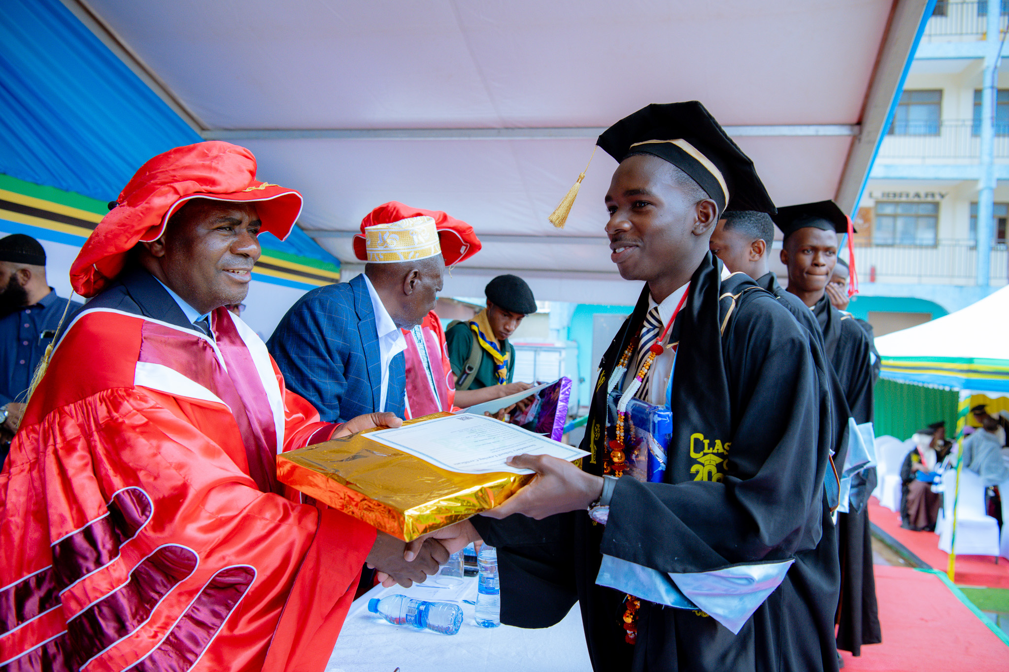 Naibu Waziri wa Fedha, Mhe, Mhandisi Mshamu Ali Munde (Mb), akiwatunuku vyeti na zawadi wanafunzi waliyofanya vizuri kwenye masomo mbalimbali, wakati wa Mahafali ya 20 ya Kidato cha Sita ya Shule ya Sekondari Thaqaafa, wilayani Nyamagana jijini Mwanza alipokuwa Mgeni Rasmi katika mahafali hayo.