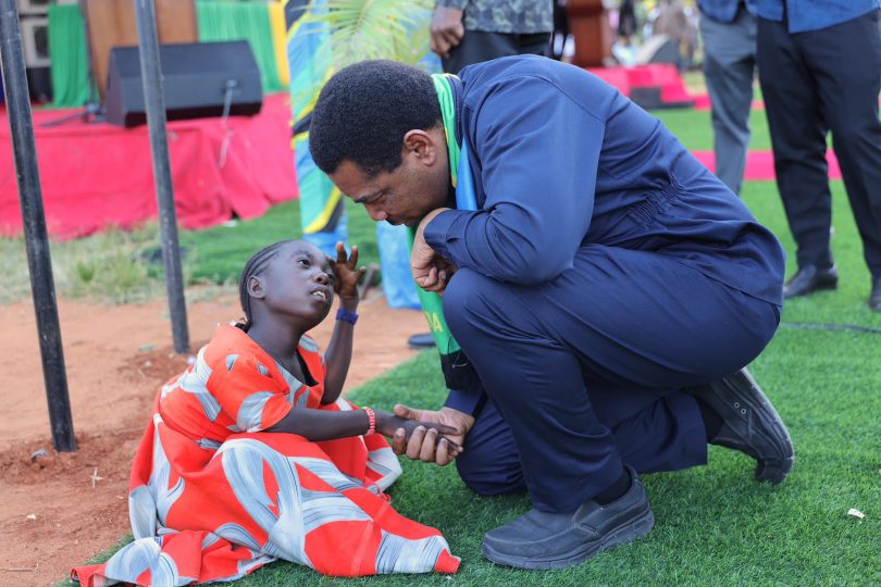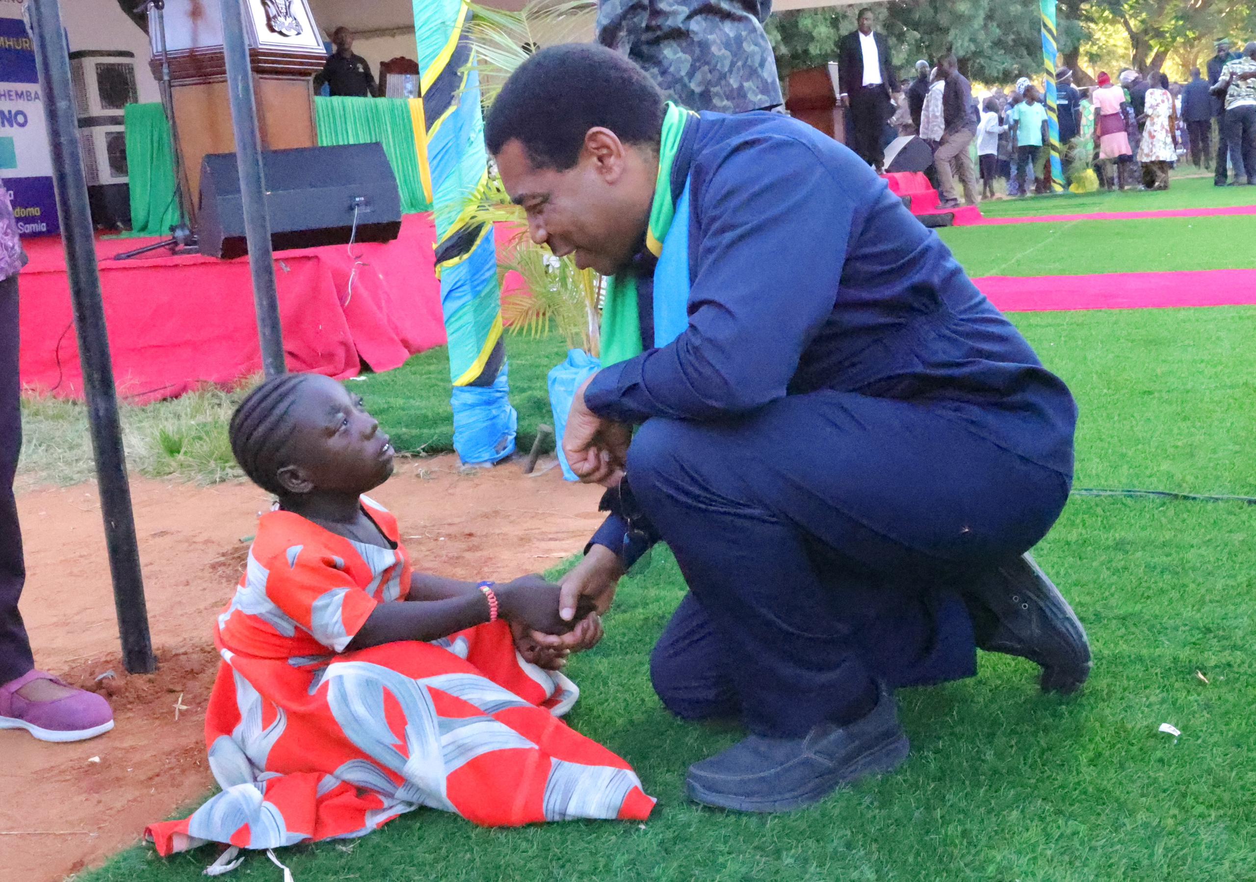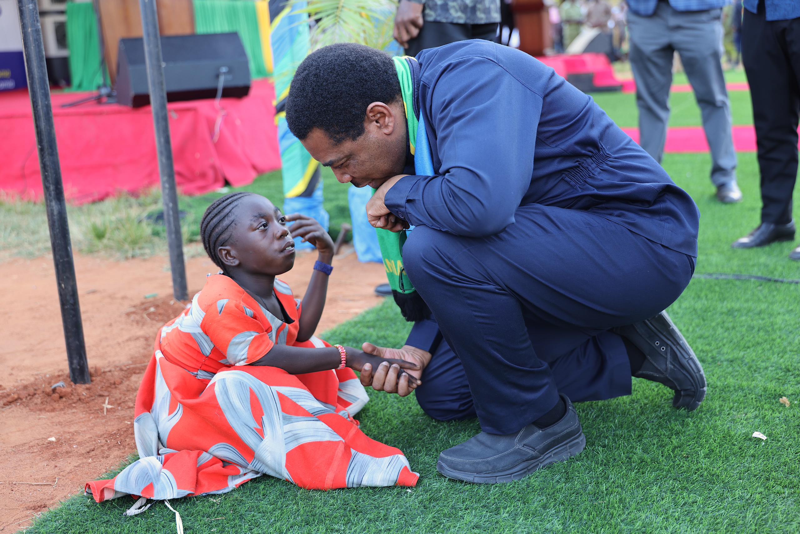 Waziri Mkuu, Dkt. Mwigulu Nchemba akiteta na Elina Mwandu (mwenye Mahitaji Maalum) baada ya kuhutubia mkutano wa hadhara na kusikiliza kero za wananchi katika uwanja wa Shule ya Msingi Msanga wilayani Chamwino Dodoma, Aprili 19, 2026.