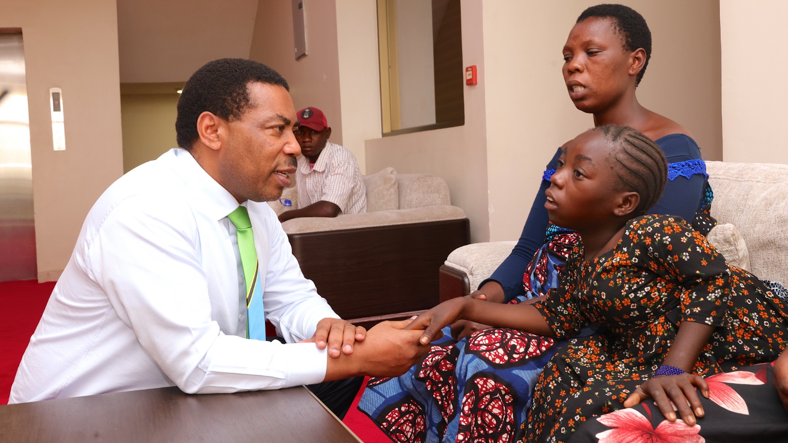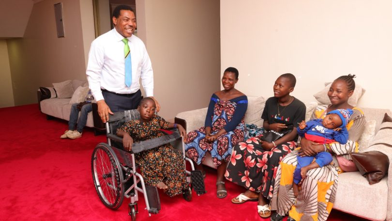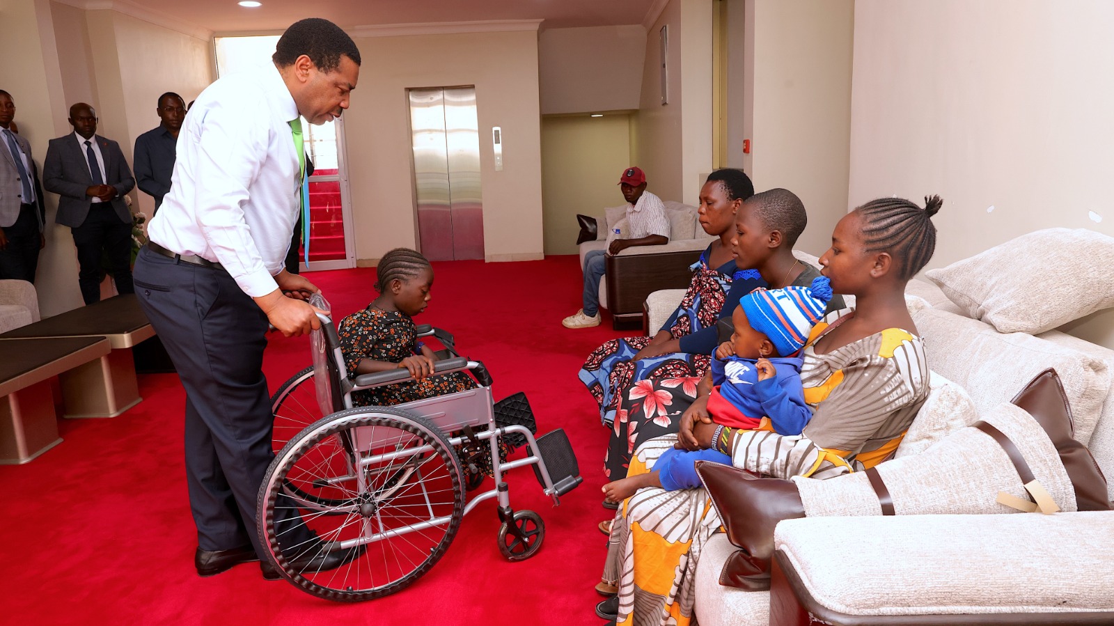 Waziri Mkuu, Dkt. Mwigulu Nchemba leo Aprili 20, 2026 amekabidhi kitimwendo kwa Helena Joseph Mwandu (mwenye mahitaji maalum), ofisini kwa Waziri Mkuu, Mlimwa jijini Dodoma. Waziri Mkuu aliahidi kumpatia Helena kiti hicho katika mazungumzo waliyoyafanya baada ya mkutano wa hadhara aliouhutubia kwenye uwanja wa Shule ya Msingi Msanga wilayani Chamwino Dodoma, Aprili 19, 2026. Wengine kutoka kulia ni Pendo Juma, Monica Simon, Rehema Joseph , Paul Joseph na Mtoto aliyepakatwa ni Dorcas Paul. (Picha na Ofisi ya Waziri Mkuu)